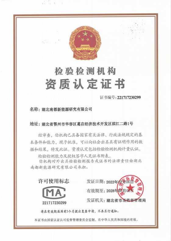 日前,优德官方网站w88子公司湖北优德官方网站w88新能源研究有限公司(简称“湖北研究院”),获得由国家市场监视管理总局批准的磨练检测机构资质认定证书(CMA证书),这标记着着实验室的系统管理水平和检测手艺能力均抵达国家认可水平,优德官方网站w88也成为海内储能领域为数未几的,同时拥有CNAS和CMA双资质认定实验室的企业。