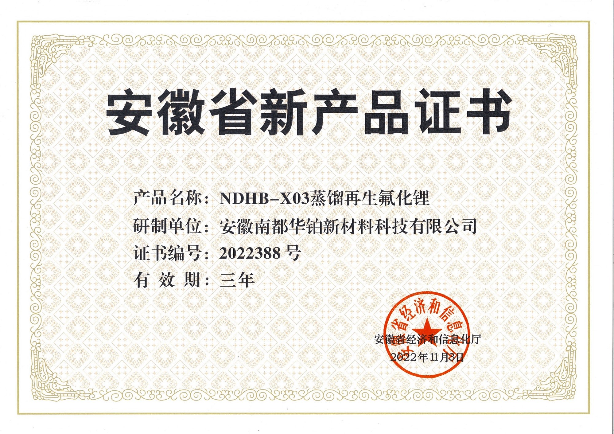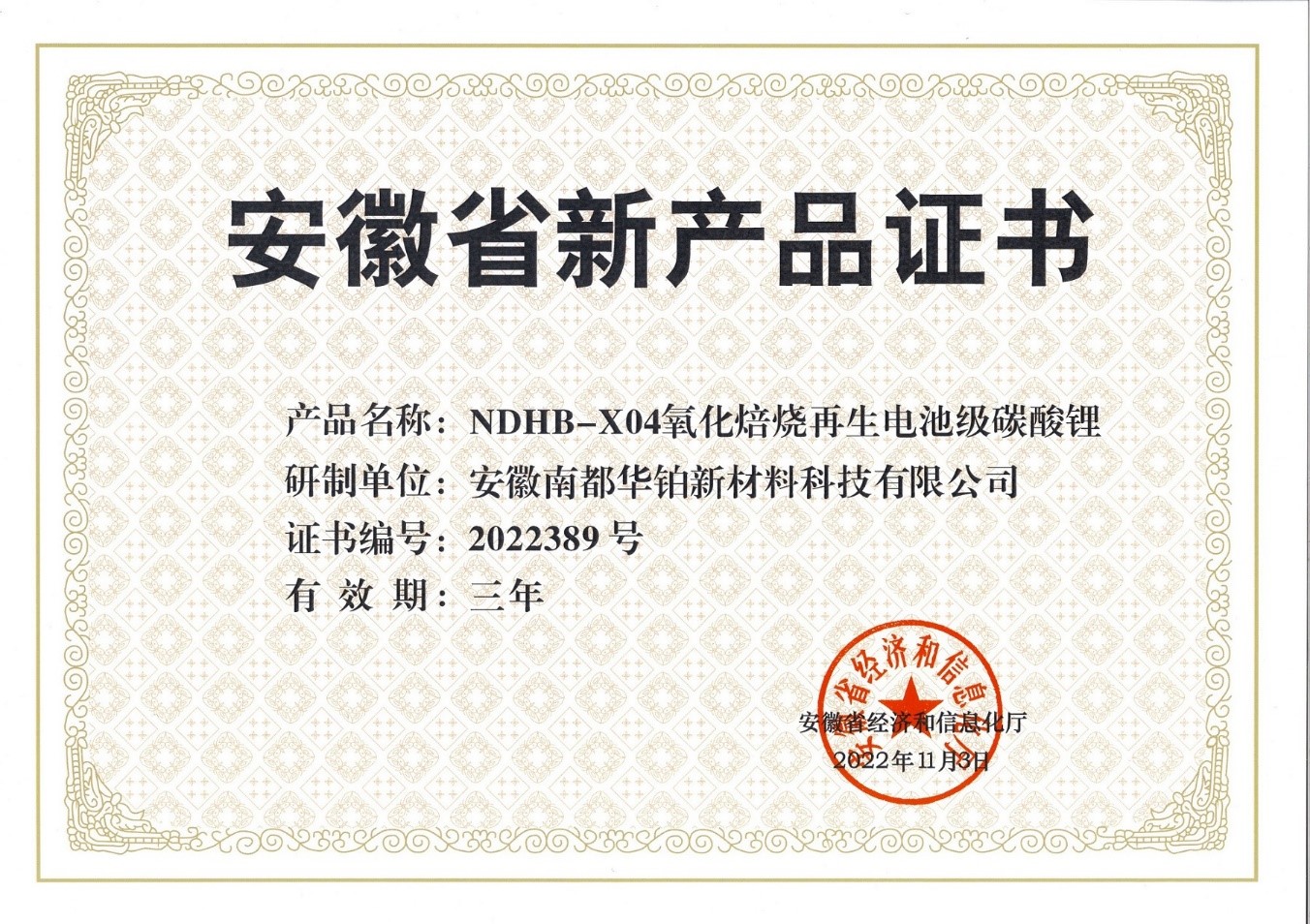ÈÕǰ£¬°²»ÕÓŵ¹ٷ½ÍøÕ¾w88»ª²¬ÐÂÖÊÁϿƼ¼ÓÐÏÞ¹«Ë¾Ñз¢µÄ¡°NDHB-X04Ñõ»¯±ºÉÕÔÙÉúµç³Ø¼¶Ì¼Ëáﮡ±ºÍ¡°NDHB-X03ÕôÁóÔÙÉú·ú»¯¼Ø¡±Á½Ïî²úÆ·£¬ÈÙ»ñ°²»ÕÊ¡¾¼ÃºÍÐÅÏ¢»¯ÌüÈ϶¨½ÒÏþµÄ2022Äê¶ÈµÚÈýÅú¡°°²»ÕʡвúÆ·Ö¤Ê顱¡£